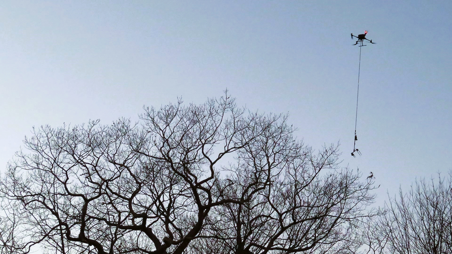 The DJI Matrice 300 drone used in the demonstration has self-heating batteries that can work in the winter, the ideal time for web removal. With the robotic tool in place, it can operate for about 35 minutes before needing a fresh battery. Massey was convinced that it could be cost-competitive with mechanical clipping from bucket trucks.